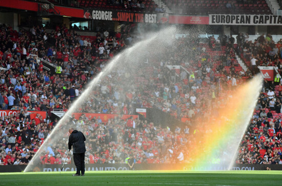 What a picture as a groundsman makes running repairs to the Old Trafford pitch: