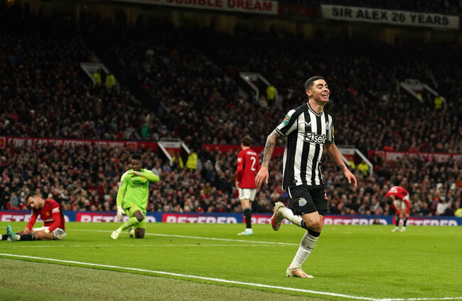 MIGUEL ALMIRON, LEWIS Hall and Joe Willock fired Newcastle to a famous first Old Trafford victory in a decade as Carabao Cup holders Manchester United suffered a second 3-0 home humiliation in four days.