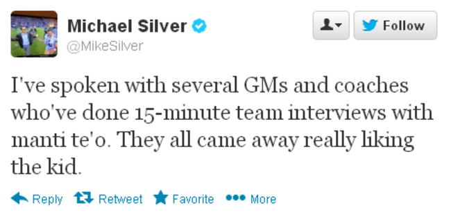 On the other hand, all indications are that Te’o has quelled some fears about the whole imaginary girlfriend thing in his meetings with teams.