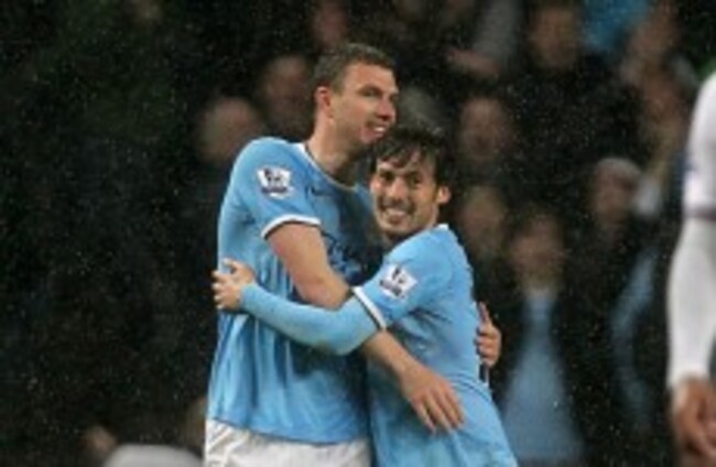 Dzeko and Silva celebrate yesterday.