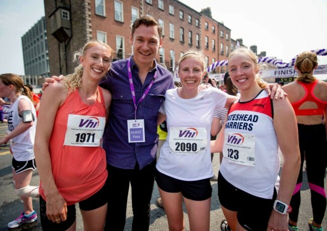 2. Former European indoor 400m champion David Gillick congratulates his wife Charlotte Gillick, Kate Wickham and Sophie Wickham after they crossed the finish line in Dublin.