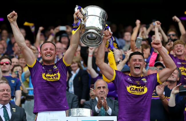 Wexford joint captains Matthew O'Hanlon and Lee Chin lift the Bob O'Keeffe Cup in 2019. Ryan Byrne/INPHO