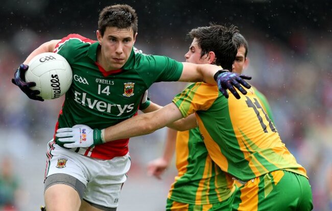 Mayo’s Alan Freeman and Ryan McHugh of Donegal