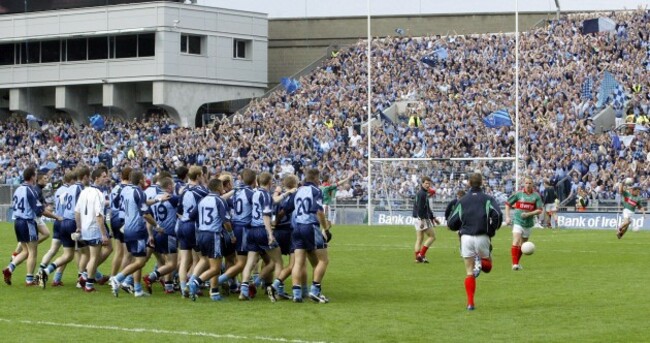 Arms linked, Dublin’s players marched down to prepare as usual in front of their famous sea of blue on the Hill. Mayo didn’t budge.