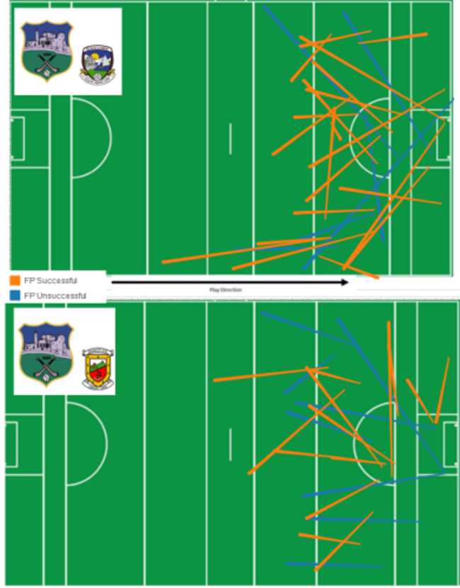 Moran’s influence was clear under the high balls but it also severely affected Tipperary’s tactics in other ways. If we take a look at the image below we can compare Tipperary’s kick passing across the 2 games.