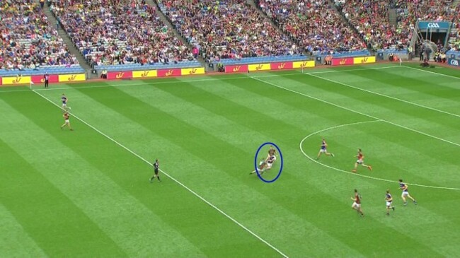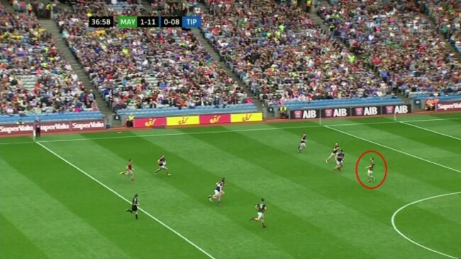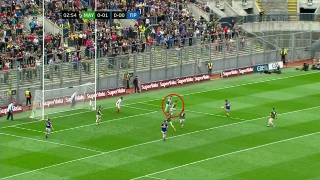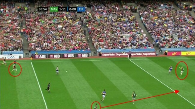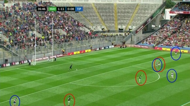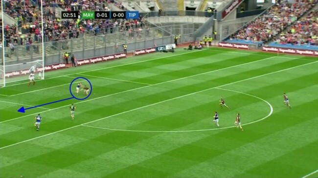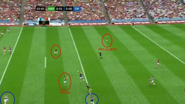Tipperary field a magnificent high ball but Mayo look exposed. As the ball is won, it is Barry Moran who is contesting, while McLaughlin is in his advanced role. The two Tipperary players at the bottom of the screen are unmarked, despite Mayo having a spare man in midfield.