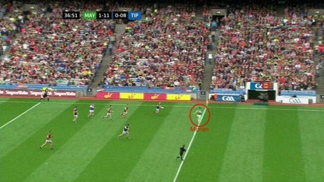 Moran was in midfield to contest it. As Tipperary attack, Mayo look much more organised in defence.