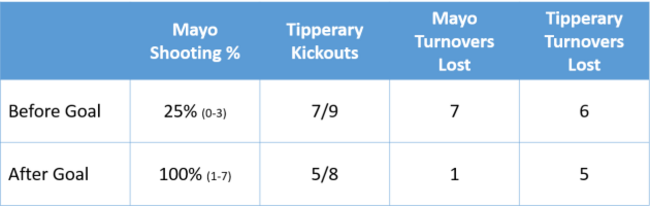 One of the big differences was the turnovers. Before the goal Mayo had coughed up possession at least seven times, afterwards just once.