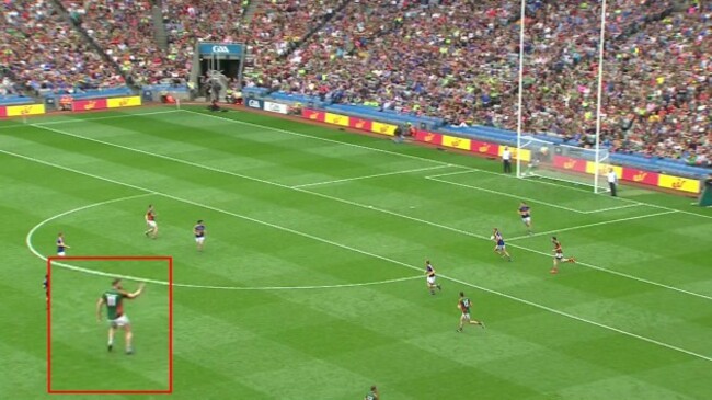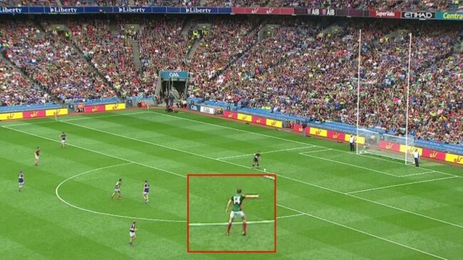 The following example is just after Diarmuid O’Connor points. Mayo have set up with their zone again and Andy Moran is actually pointing to where he wants Evan Comerford to kick the ball.