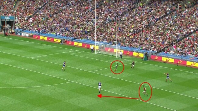 We can see Colm Boyle on the far right urging his midfield to get back. Donal Vaughan is in pursuit and Seamus O’Shea is doing his best swing around and fill that hole down the centre.