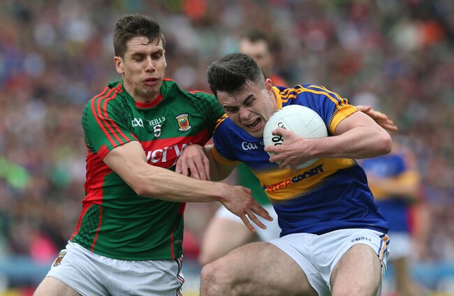 Peter Acheson in action today for Tipperary against Mayo's Aidan O'Shea. Lorraine O'Sullivan / INPHO