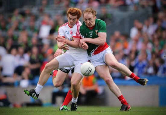 Mayo’s Keith Higgins and Tyrone’s Mark Donnelly.