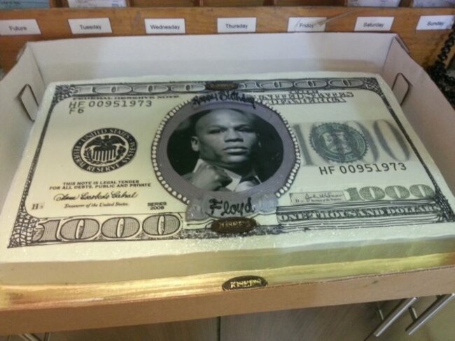 Mayweather’s promoters Showtime sent him this cake, featuring his face on a thousand dollar bill: