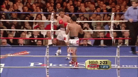By now wary of the pump-fake which put him on the seat of his pants during their first meeting, the Mexican had his cross loaded this time around. By ducking under Manny’s jab in clip 10, Marquez creates the leverage for his own fearsome overhand right.