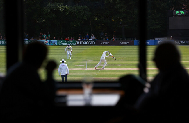 People in Pavilion at Stormont watching Zimbabwe captain Craig Ervine battling as Ireland plays its first ever Test match in Belfast. Alamy Stock Photo