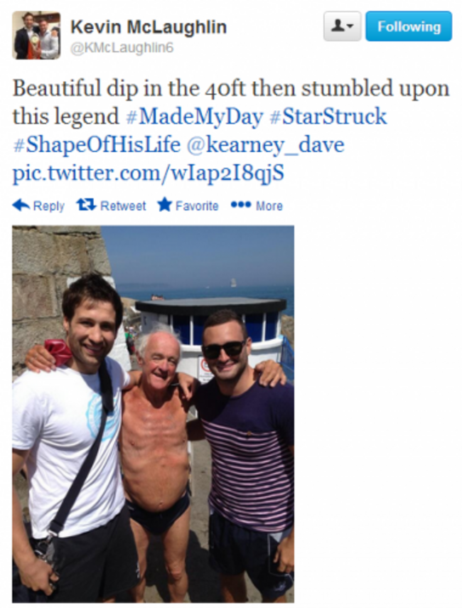 LEINSTER’S KEVIN MCLAUGHLIN and Dave Kearney were soaking up the sun down at the 40-foot in Dun Laoghaire today when they ran into an Irish acting legend.