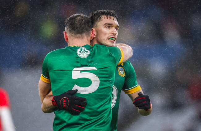 Meath's Donal Keogan and Ciaran Caulfield celebrate winning. Tom Maher/INPHO