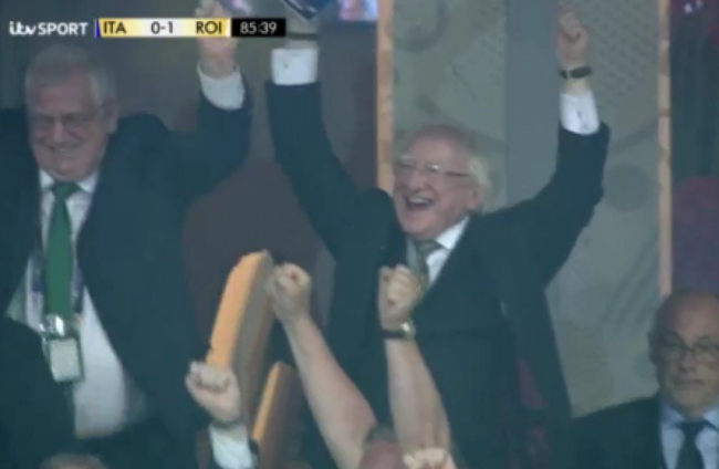 President Michael D Higgins was photographed celebrating Robbie Brady’s dramatic winner against Italy in Lille with FAI chief executive John Delaney. Afterwards he congratulated Martin O’Neill’s side, as well as Michael O’Neill’s Northern Ireland.