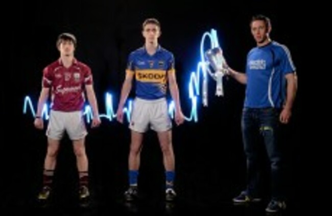 Kilkenny's Michael Fennelly with Galway's Eanna Burke and Tipperary's Barry Heffernan at the launch of the Electric Ireland minor championships. Paul Mohan / SPORTSFILE