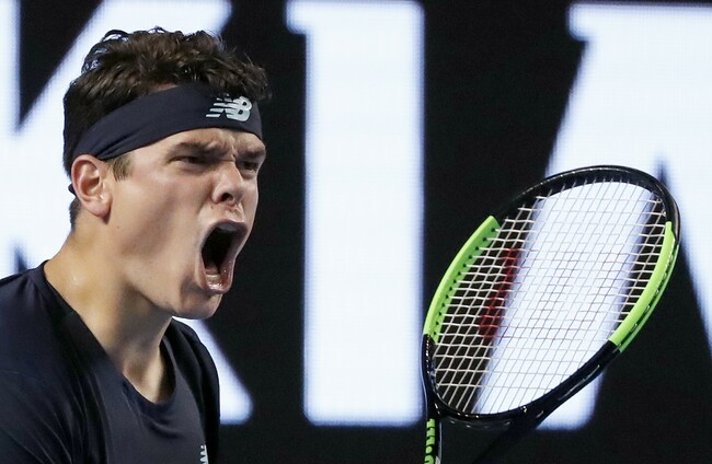 Milos Raonic lets out a roar after securing his four-set win against Roberto Bautista Agut. Dita Alangkara