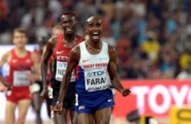 Farah celebrates after crossing the line. Darron Cummings