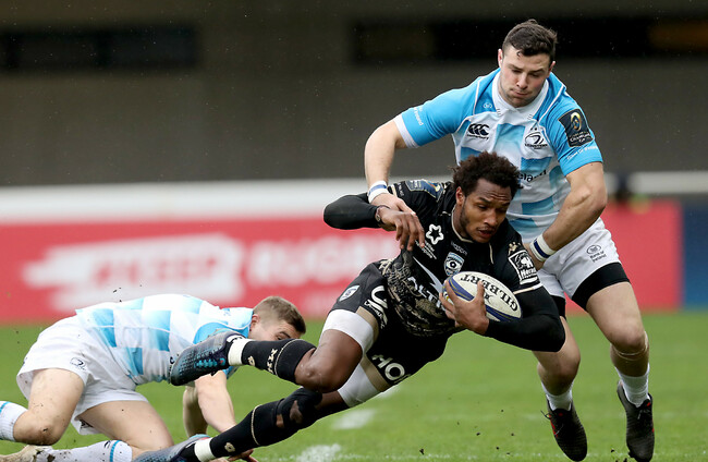 MATCH SHOT: Robbie Henshaw and Jordan Larmour double up to tackle Montpellier fullback Benjamin Fall.