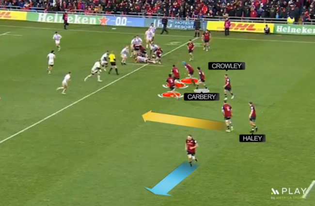 As highlighted in red below, Munster have a pod of three forwards off Casey, with Carbery set up in behind.