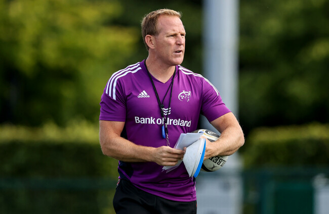 Prendergast at Munster training as Ireland forwards coach Paul O'Connell watches on. Ben Brady / INPHO
