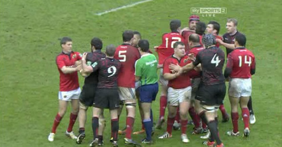 O’Gara is benched shortly after getting body-checked by Sean Cox. The out-half then lashed out with his boot at Cox, who was less than pleased.