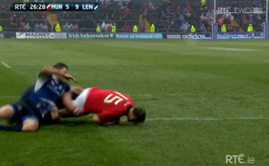 Dave Kearney had to be escorted off the pitch after he was kicked in the head by Paul O’Connell, who was trying to connect with a ball presented by the winger. (Credit: RTÉ)