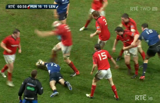 Varley is accidentally offside so the mauling chance off the lineout is missed. Leinster get the scrum and just about hang onto possession before kicking clear but right into the cradling arms of Zebo, who charges into the Leinster 22. A few phases from Munster before good Leinster scrambling wins a scrum put-in.