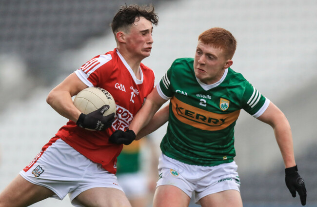 Cork’s Mark Hetherington with Daniel Kirby of Kerry. Evan Treacy / INPHO