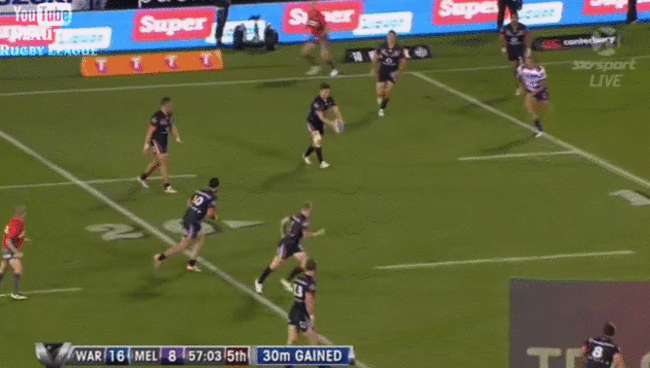 However, instead of panicking, the New Zealand Warriors’ hooker had the wherewithal to get the ball away through his legs, finding his team-mate Sam Tomkins.