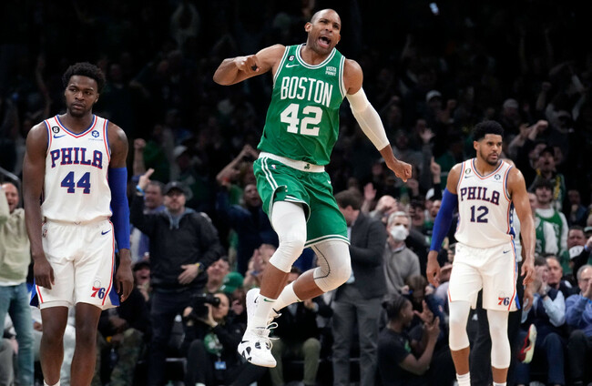 Boston Celtics center Al Horford celebrates after hitting a 3-pointer. Alamy Stock Photo