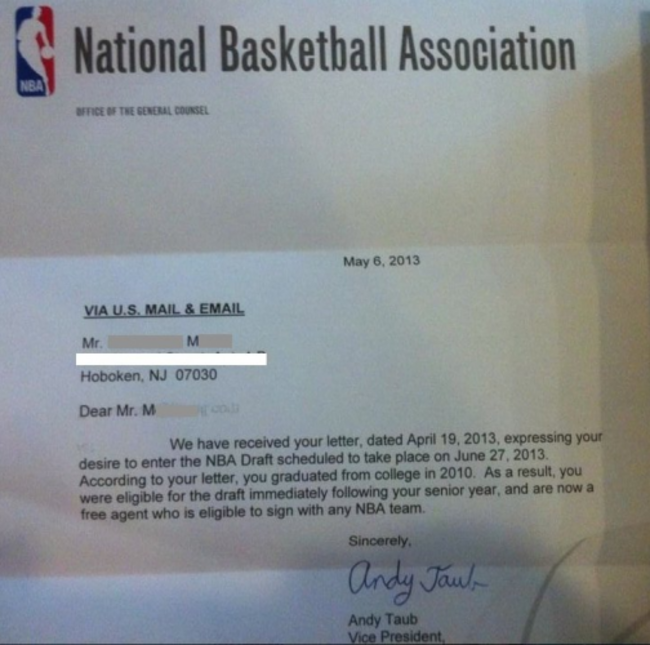 “As a result, you were eligible for the draft immediately following your senior year, and are now a free agent who is eligible to sign with any NBA team.”