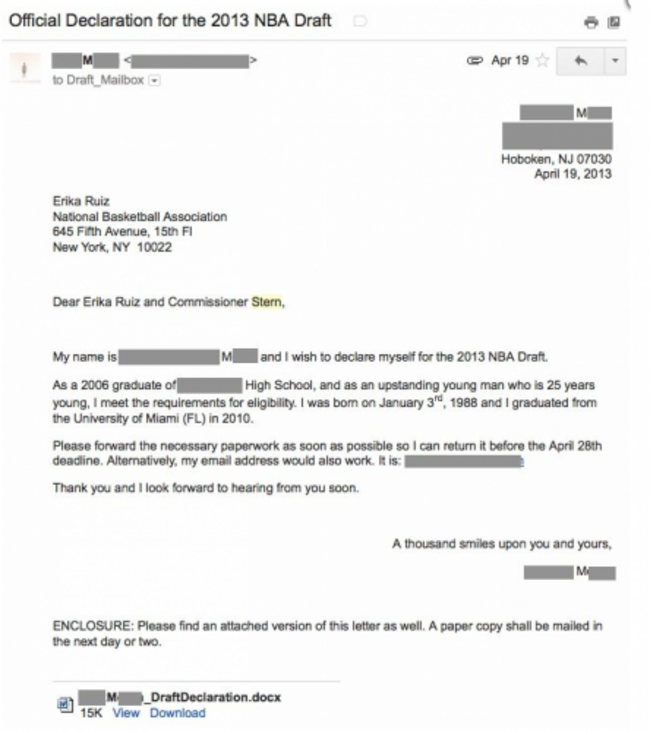 SO, A 20-SOMETHING New Jersey resident sent the NBA an e-mail on 19 April declaring his eligibility for the 2013 NBA Draft “after a few drinks.”