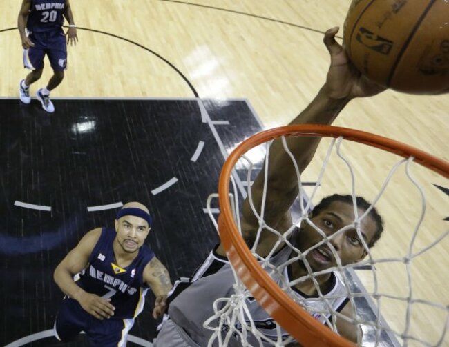 Leonard dunks with Memphis Grizzlies’ Jerryd Bayless looking on. Eric Gay/AP/Press Association Images