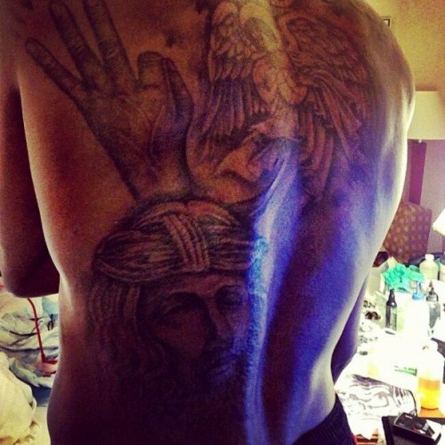 Here’s what his back looked like before his tattoos were complete, notice the blank slate on the bottom right: