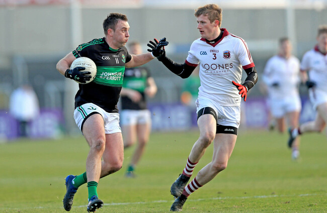 Slaughtneil’s Karl McKaigue is fouled and Nemo concede a late, late free.