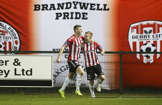 Harry Monaghan and Nicky Low celebrate after Nathan Boyle's goal for Derry City in their recent win against Dundalk at Maginn Park. Presseye/Lorcan Doherty/INPHO