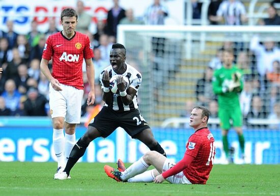 Tiote is next to see yellow. The hard-tackling Ivorian catches Wayne Rooney but doesn’t feel the card is deserved and throws a strop to protest his innocence (see below). Newcastle are battling their way back into this one and Cabaye has just shot over from a lay-off the to edge of the box.