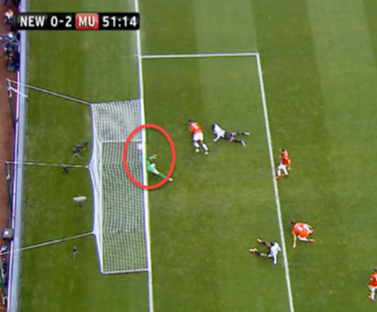 Replays show a large part of the ball is over but whether the whole ball is, it’s extremely difficult to call. Either way, Newcastle haven’t been awarded the goal.
