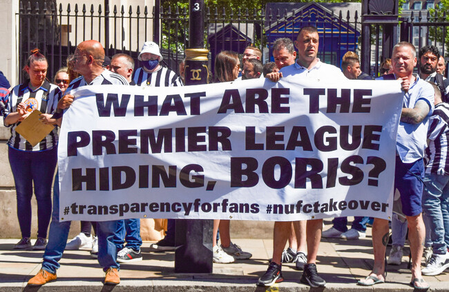 Protesters hold a banner saying 'What Are The Premier League Hiding, Boris?' during a demonstration by Newcastle United fans outside Downing Street. SIPA USA/PA Images