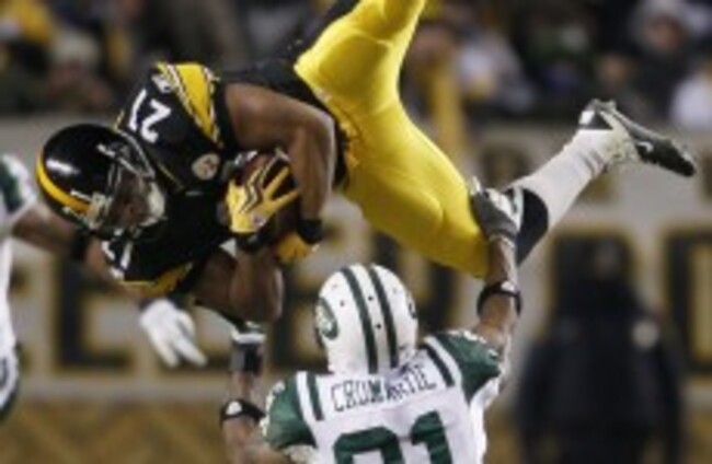 New York Jets cornerback Antonio Cromartie tackles Pittsburgh Steelers running back Mewelde Moore during the AFC Championship game last night. AP Photo/Matt Slocum