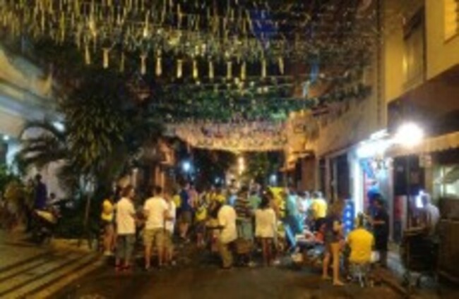 Apart from the 15 people gathered around a television at a newspaper kiosk, the street was deserted. Outside a bar on Rua Edmundo Lins we found two televisions (one with the almost obligatory two-second delay) and a bunch of Australians, who were dressed appropriately in their yellow shirts and had pleased the locals further by sticking a Neymar jersey on their inflatable kangaroo.