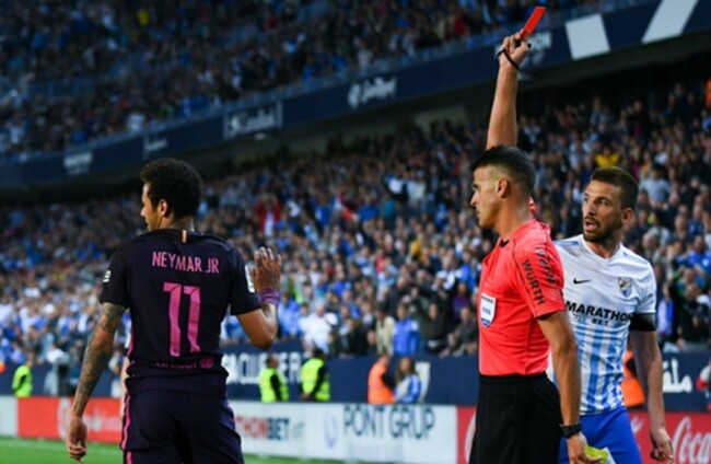 NEYMAR WAS SENT off as Barcelona’s title hopes suffered a shock setback with a 2-0 defeat against Malaga in Saturday’s La Liga encounter at La Rosaleda.