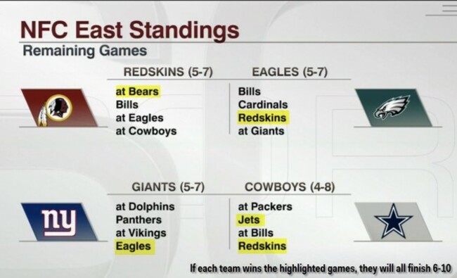 Of a greater concern is that the NFC East is so bad that there are multiple scenarios in which the winner of the division will be 6-10 and at least one in which all four teams finish tied at 6-10. This means, not only would a 6-10 team make the playoffs, they would also host a playoff game at home against a far-more-deserving Wild Card team thanks to the NFL’s archaic division and playoff-seeding system.