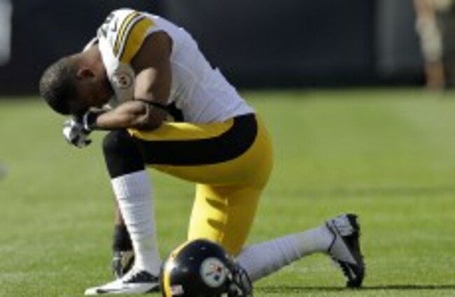 Pittsburgh Steelers safety Ryan Clark kneels and waits following the injury to Oakland Raiders' Darrius Heyward-Bey. Marcio Jose Sanchez/AP/Press Association Images