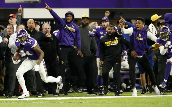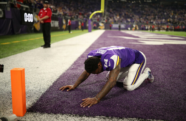 That was my second thought after Case Keenum received the shotgun snap from center Pat Elflein, took a five step drop to his own 28 yard line and heaved what initially looked like an aimless ball in the direction of the right touchline with 10 seconds remaining.