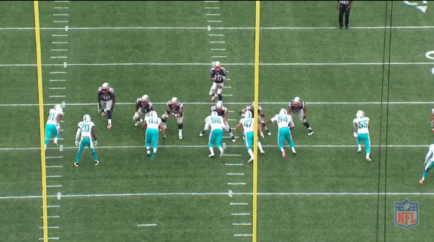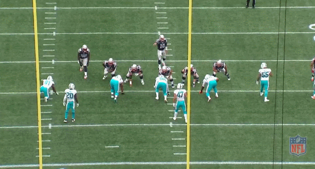 However, the risk here is that the Dolphins are only showing blitz and will actually drop their linebackers — specifically Koa Misi (#55) and Kiko Alonso (47) — or safety Jones (#20) back into zone coverage, taking away the middle of the field.